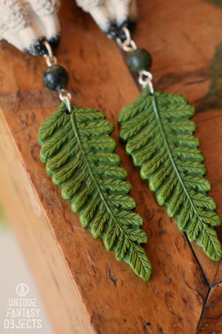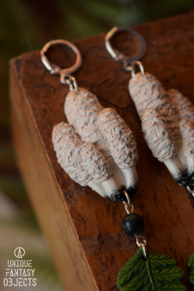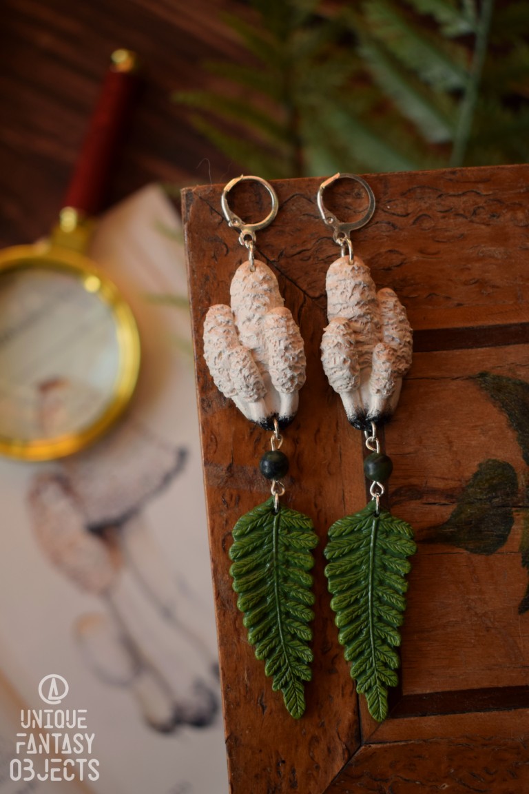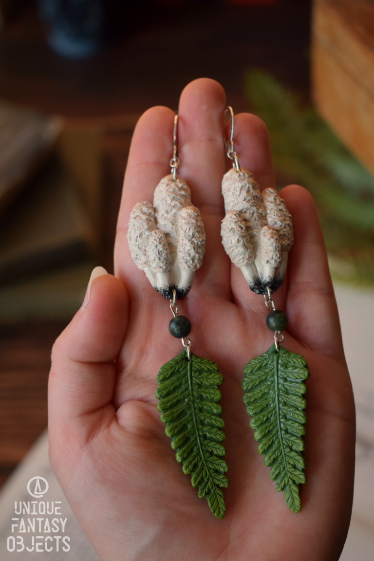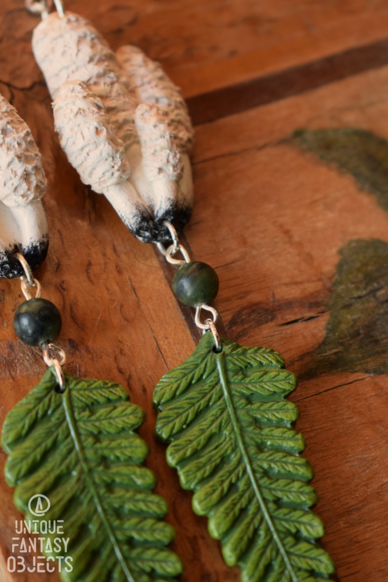 Kolczyki z grzybem czernidłak, paprocią i jadeitem (Unique Fantasy Objects)