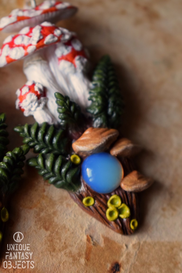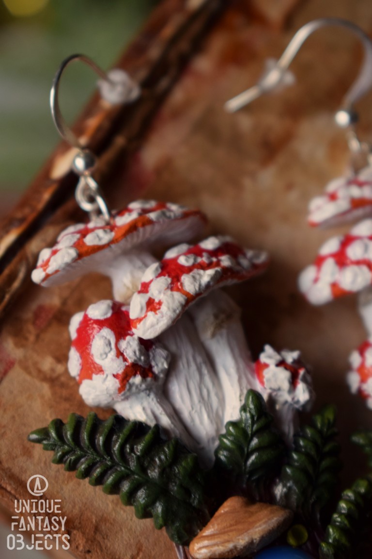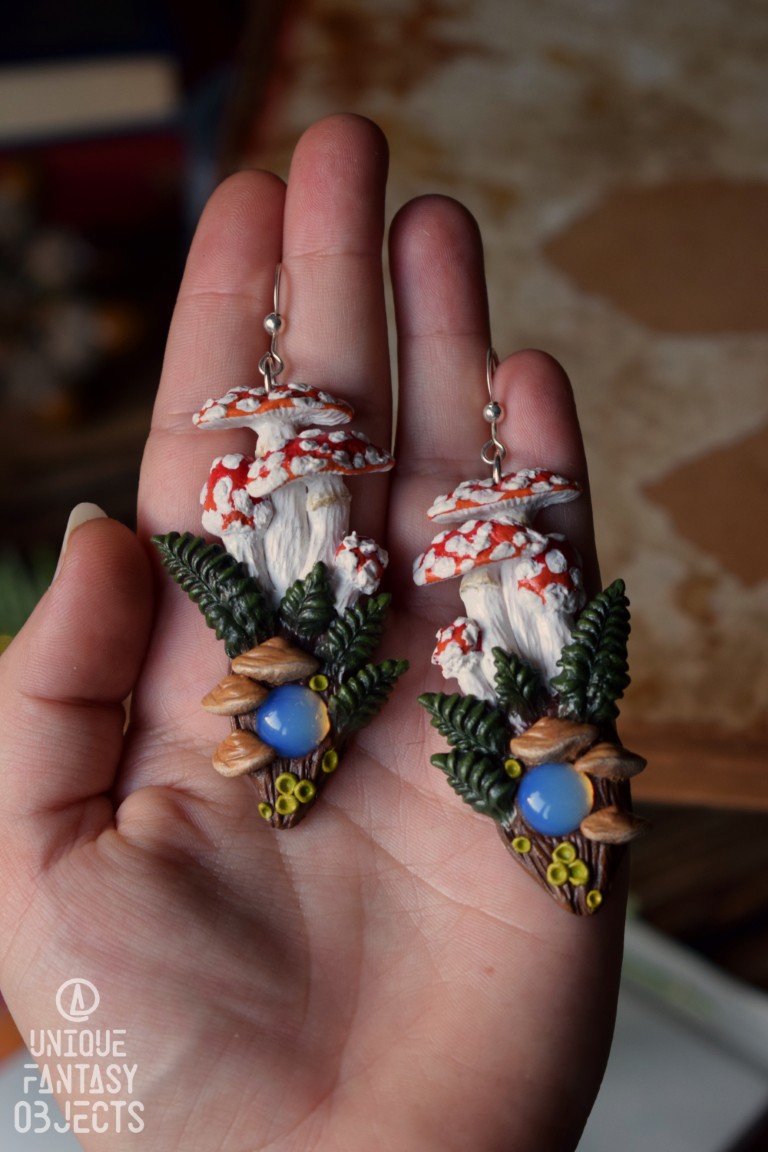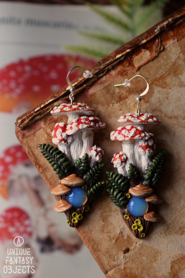 Kolczyki z muchomorami w ściółce leśnej i opalitem.