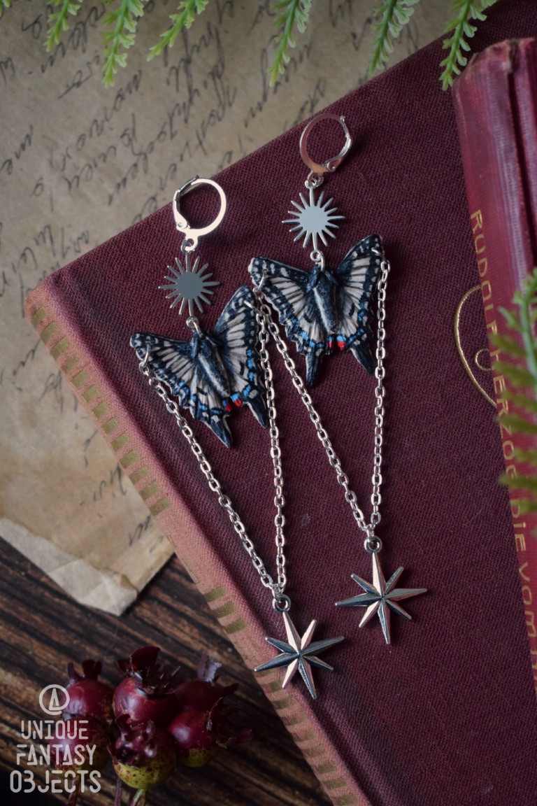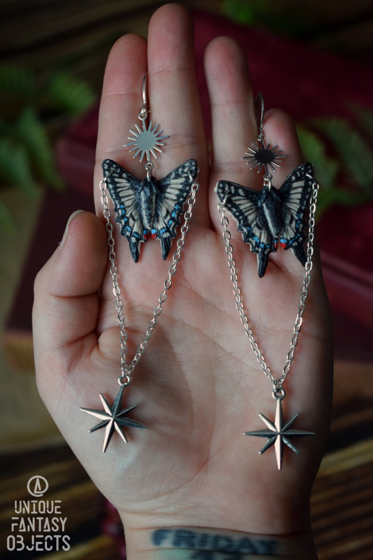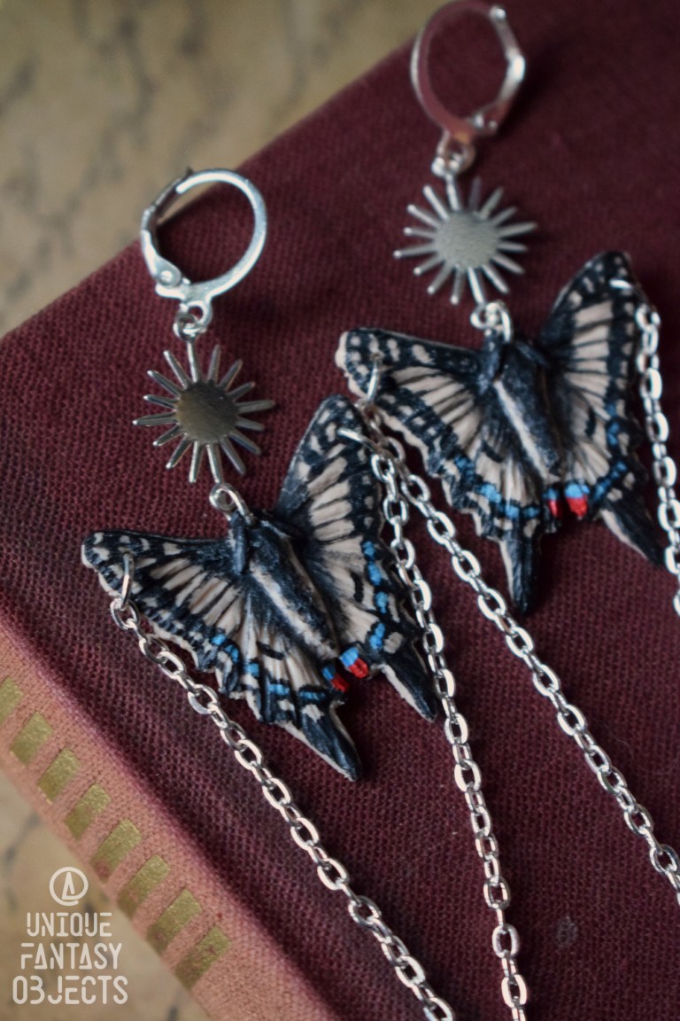 Kolczyki z rzeźbą motyla paź królowej i łańcuszkami (Unique Fantasy Objects)