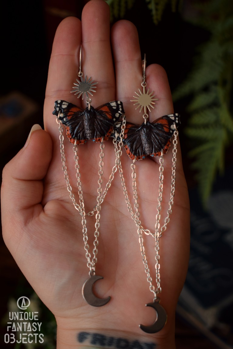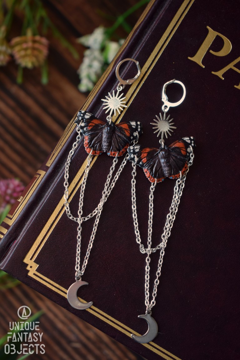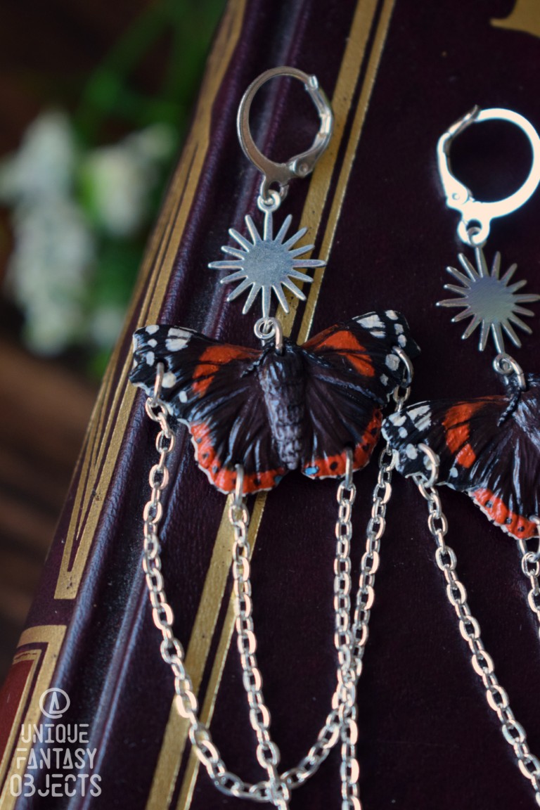 Kolczyki z rzeźbą motyla rusałka admirał i łańcuszkami.