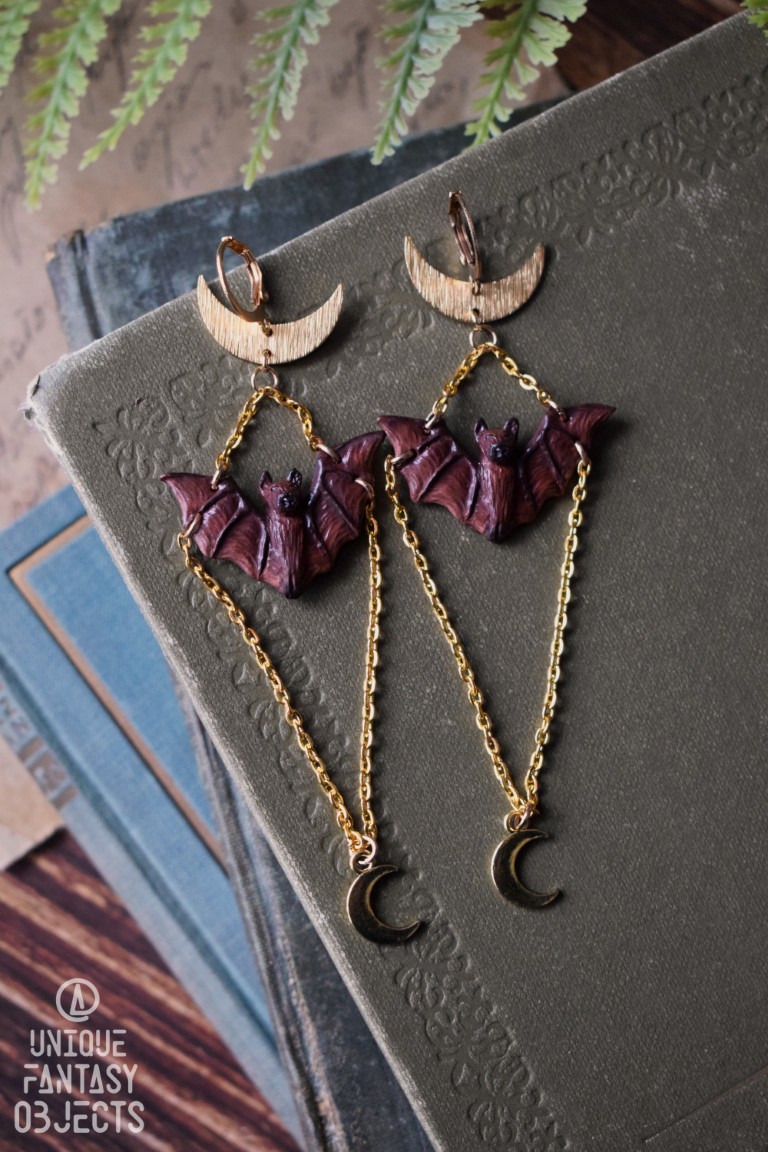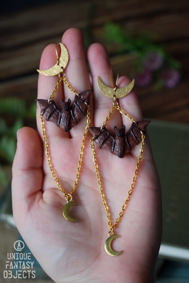 Kolczyki z rzeźbą nietoperza nocek duży i łańcuszkami.
