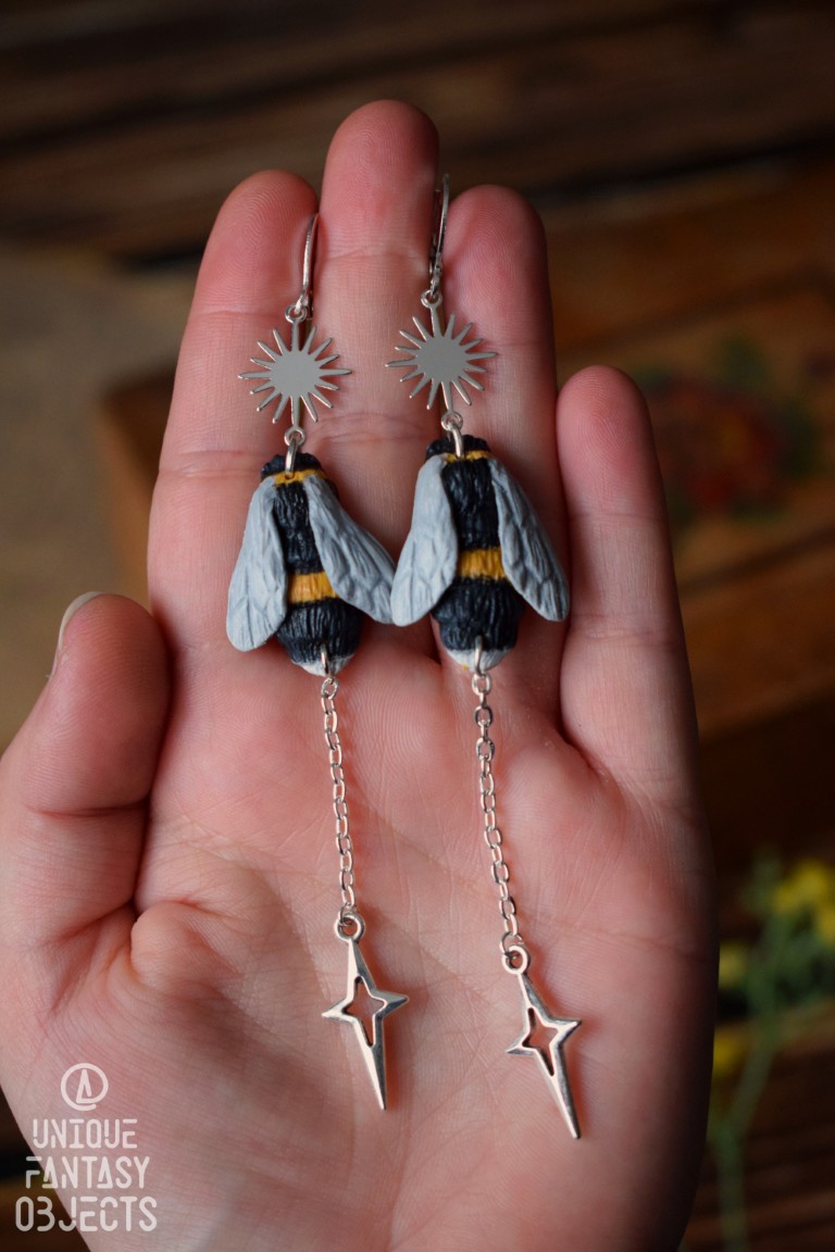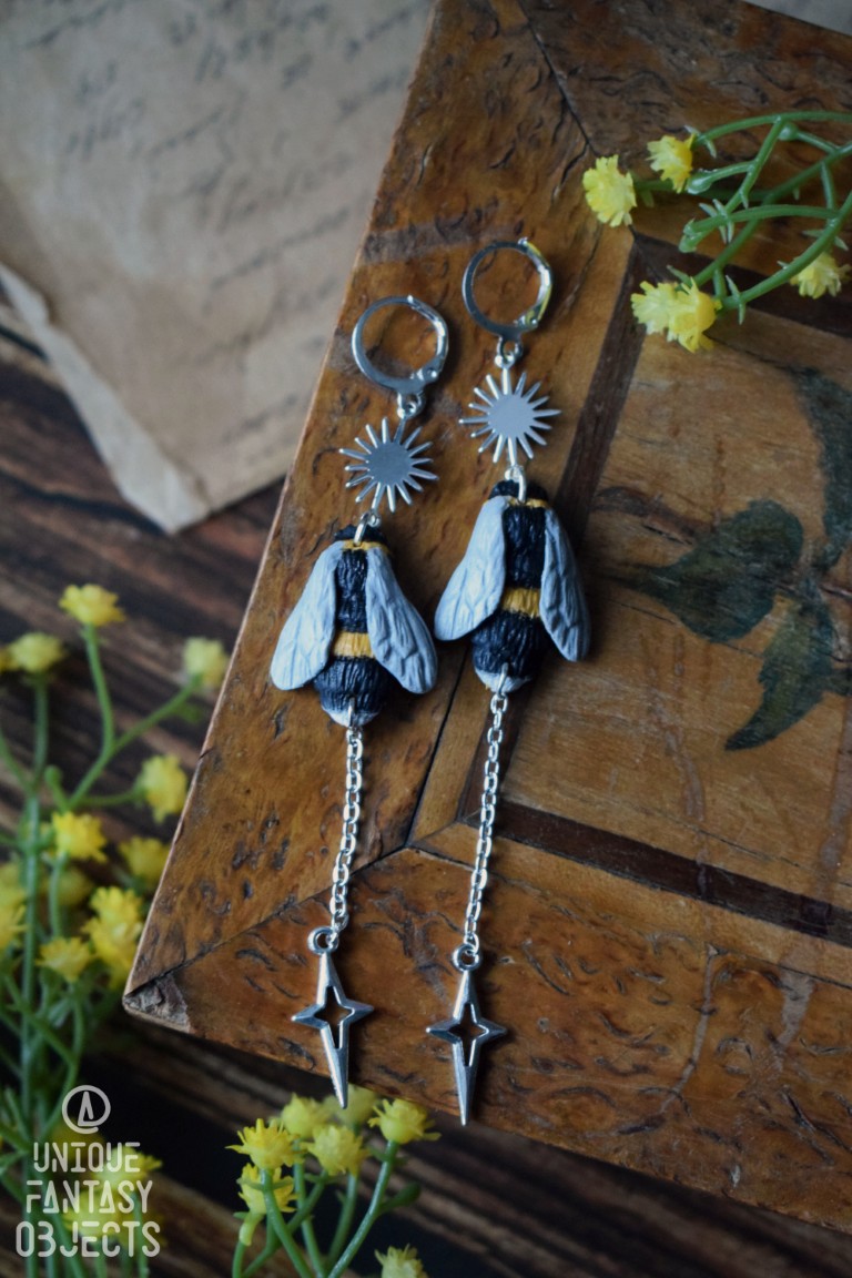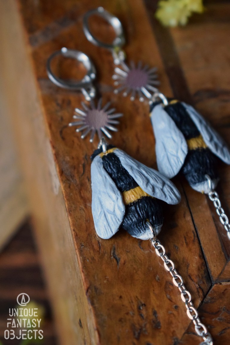 Kolczyki z rzeźbą trzmiela i łańcuszkami.
