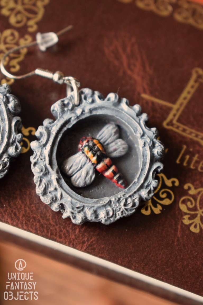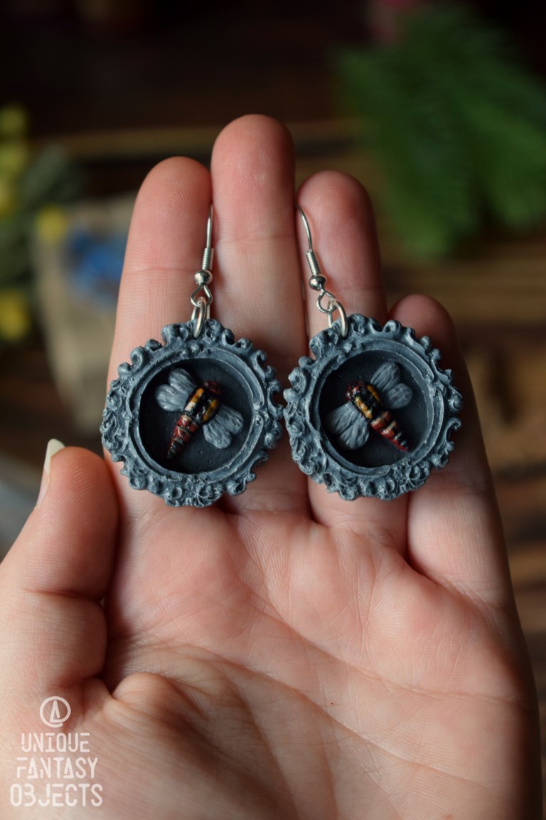 Rzeźba została wyrzeźbiona z masy polimerowej, a następnie pomalowana farbami akrylowymi. Do rzeźb zaczepiłam mocne bigle ze stali chirurgicznej, dzięki czemu możesz bezpiecznie je nosić w uszach. Całość zabezpieczyłam lakierem artystycznym, dzięki czemu kolory na ozdobie nie będą blaknąć i możesz spokojnie ją nosić, bez obawy o zarysowania.