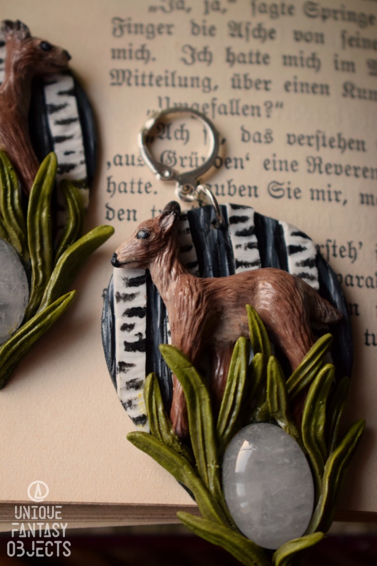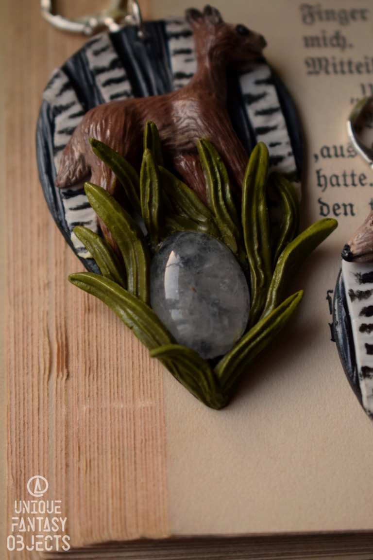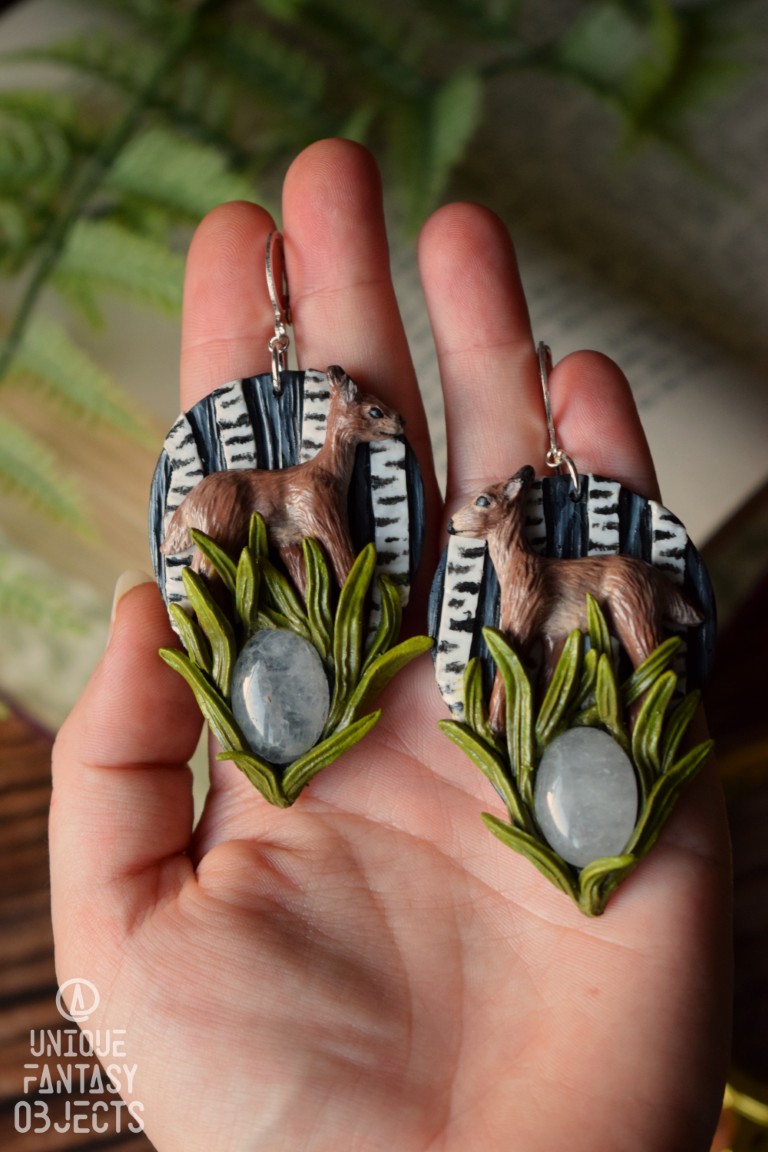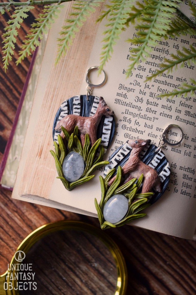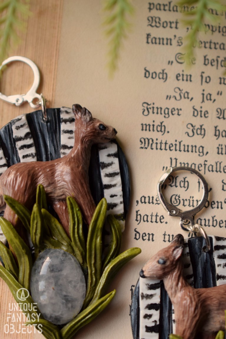 Kolczyki z sarnami w lesie i kwarcem górskim.