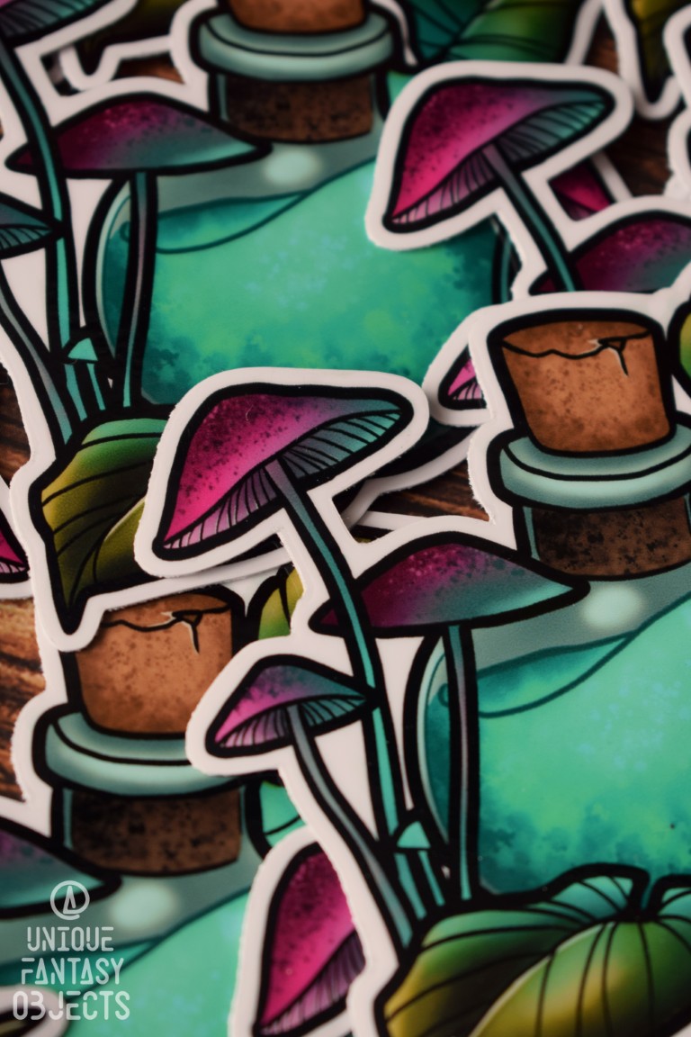 Naklejka z niebieskim eliksirem i grzybami.