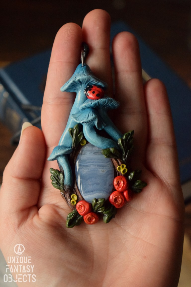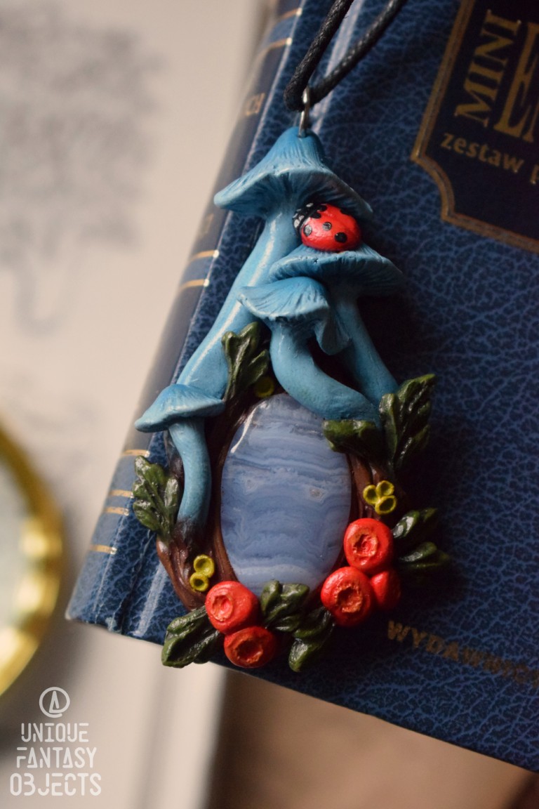 Naszyjnik z grzybem Entoloma hochstetteri, ściółką i agatem pasiastym.
