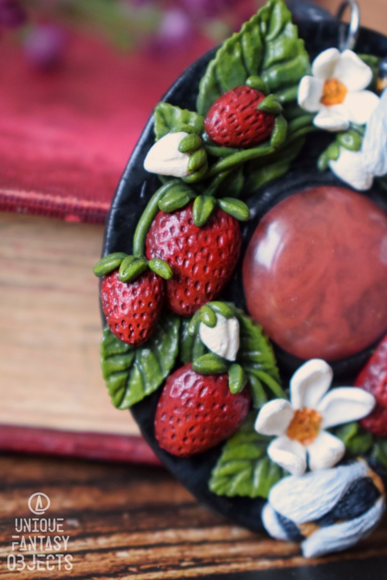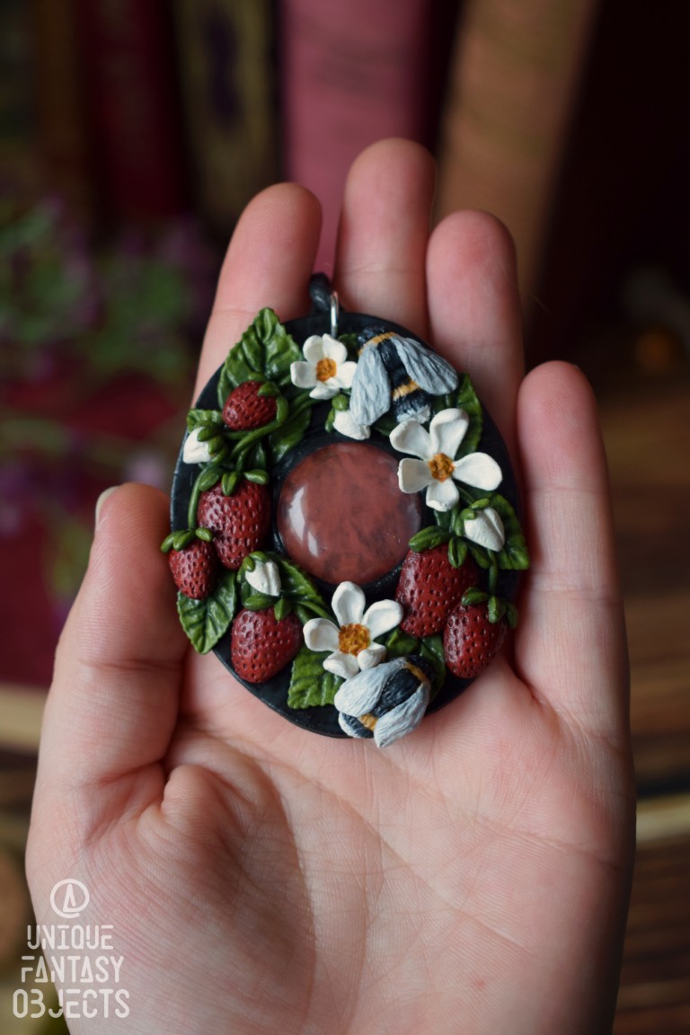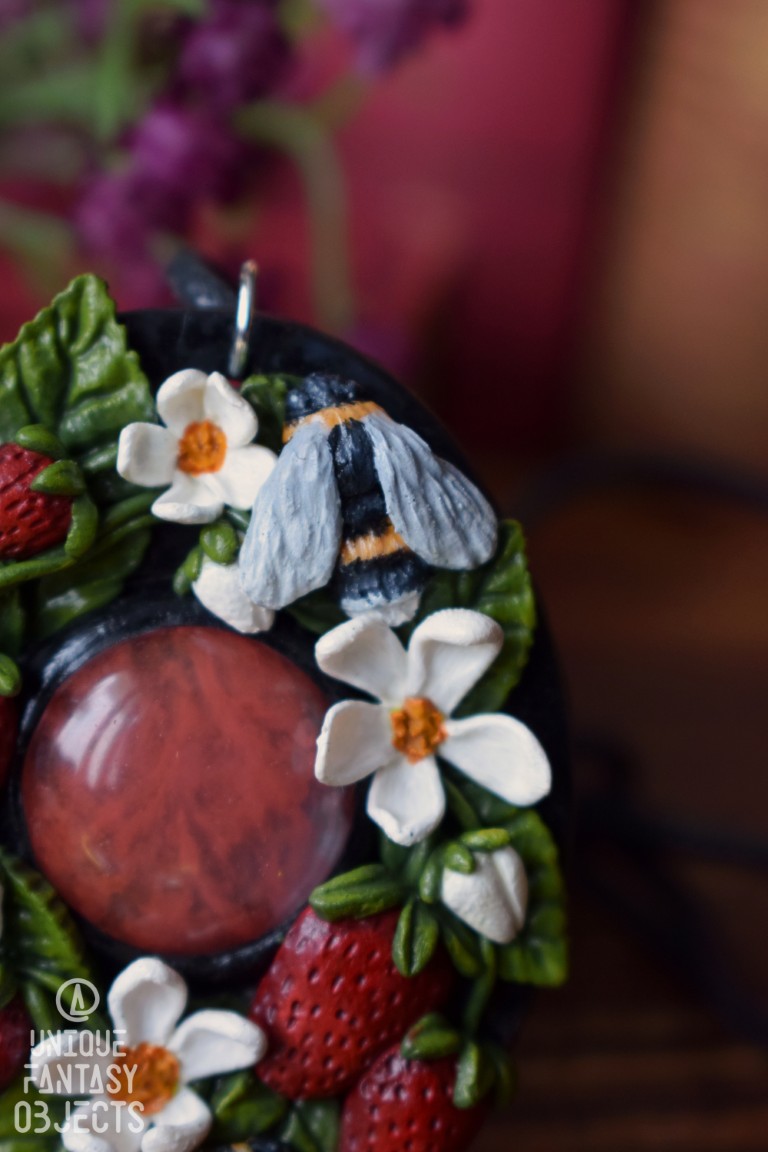 Naszyjnik z truskawkami, trzmielami i kwarcem wiśniowym.