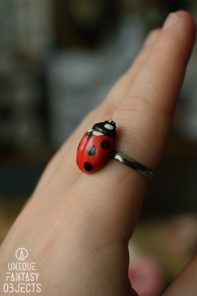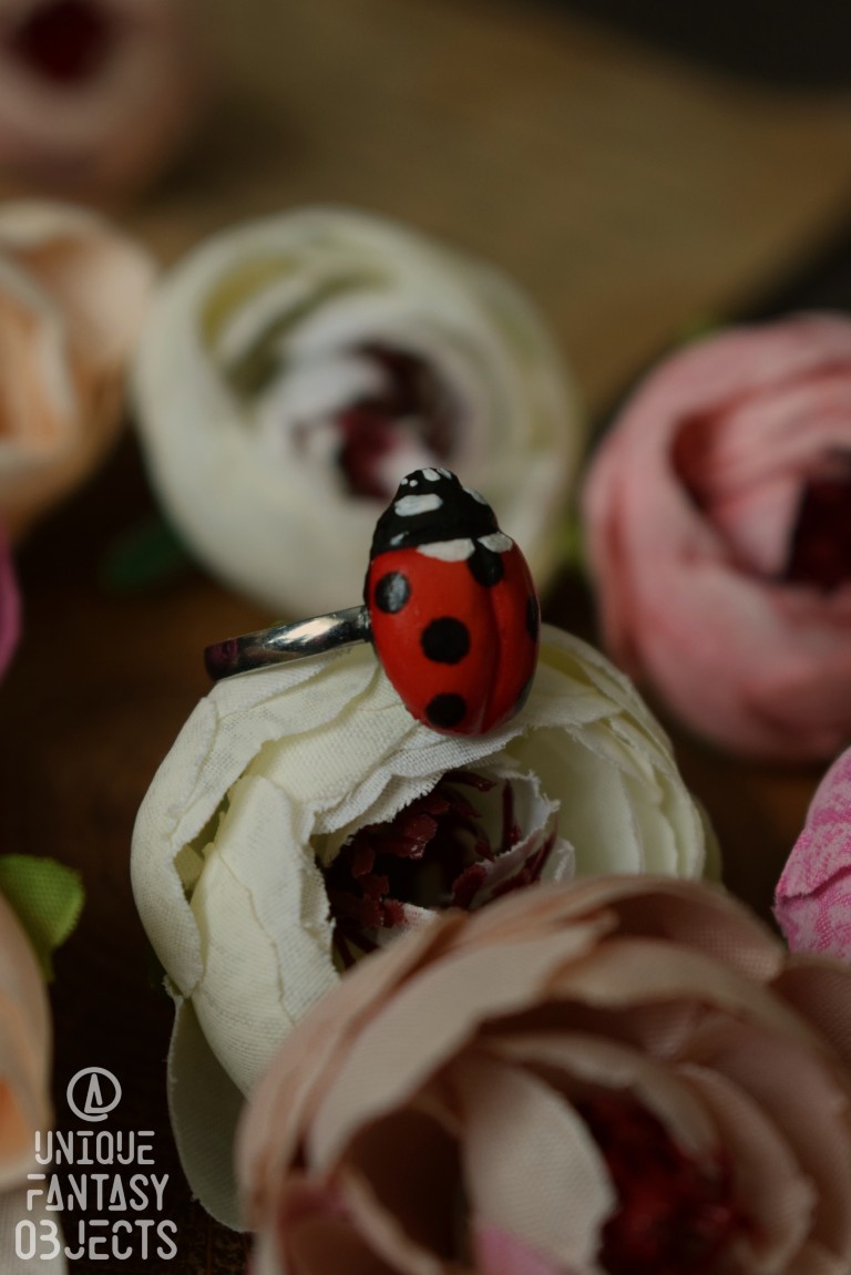 Rzeźba została wyrzeźbiona z masy polimerowej, a następnie pomalowana farbami akrylowymi. Rzeźba jest umieszczona na bazie regulowanego pierścionka. Całość zabezpieczyłam lakierem artystycznym, dzięki czemu kolory na ozdobie nie będą blaknąć i możesz spokojnie ją nosić, bez obawy o zarysowania.