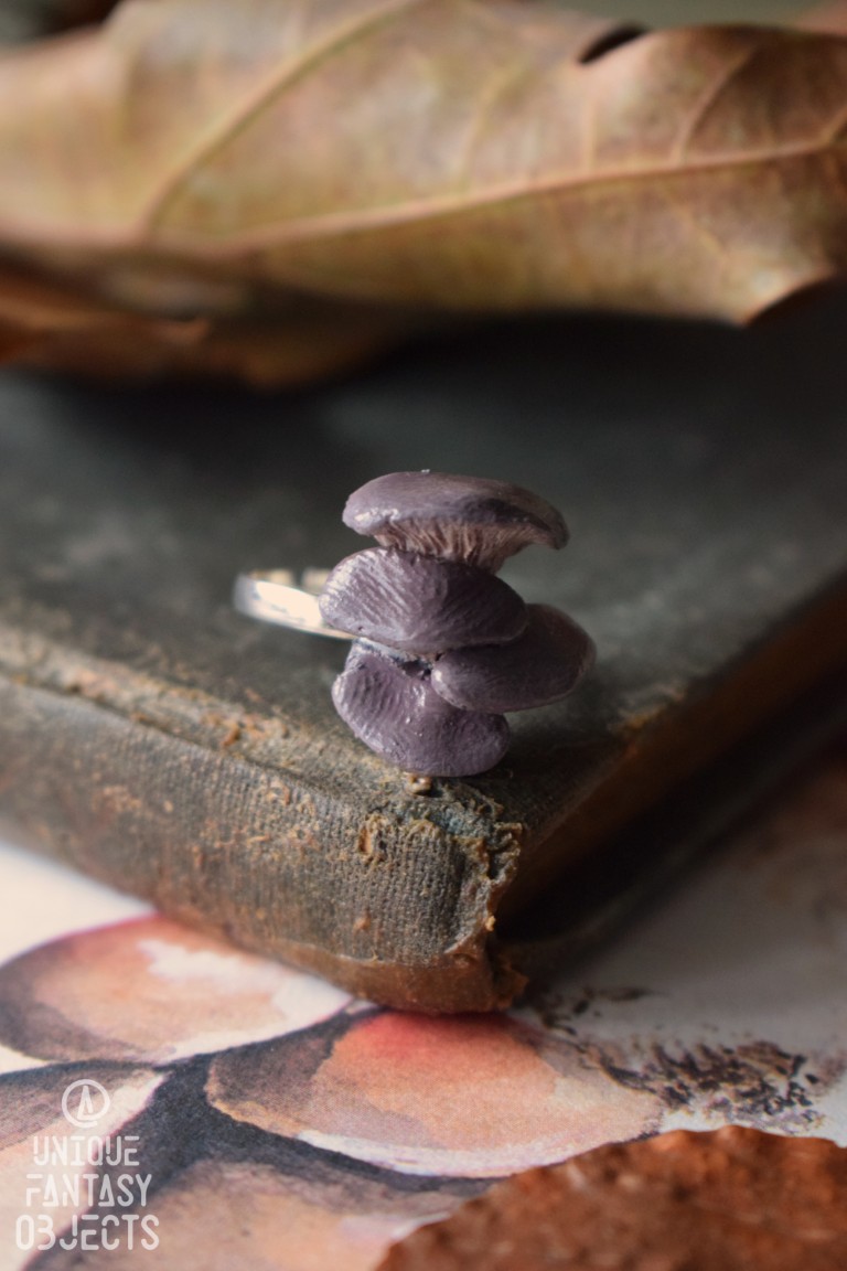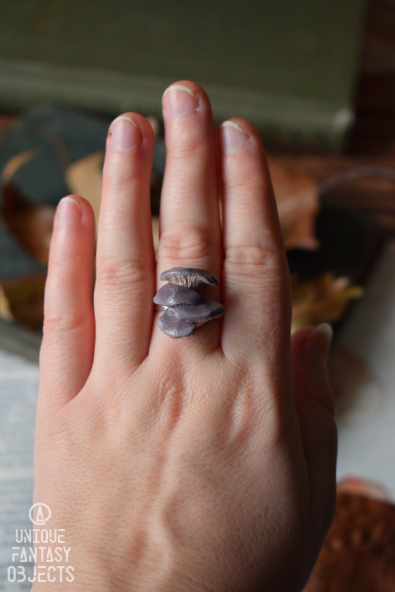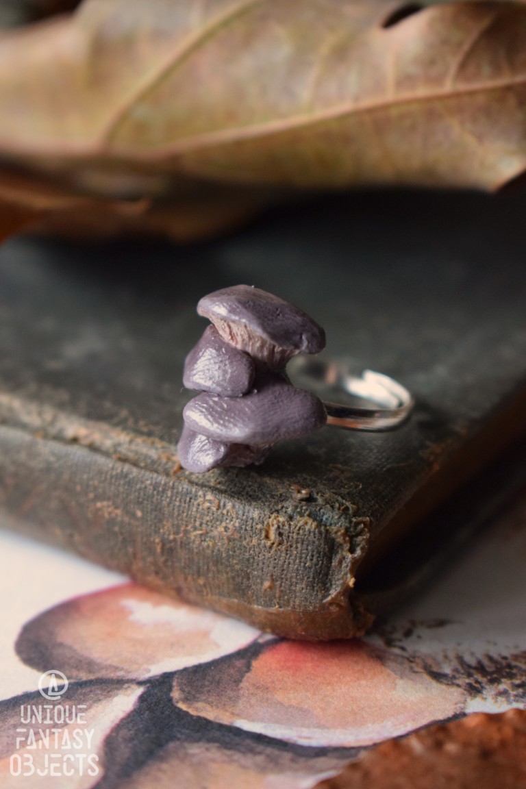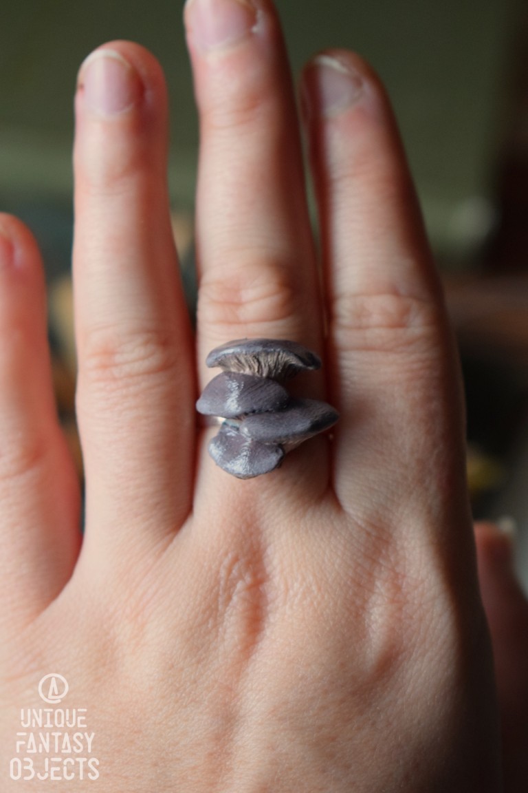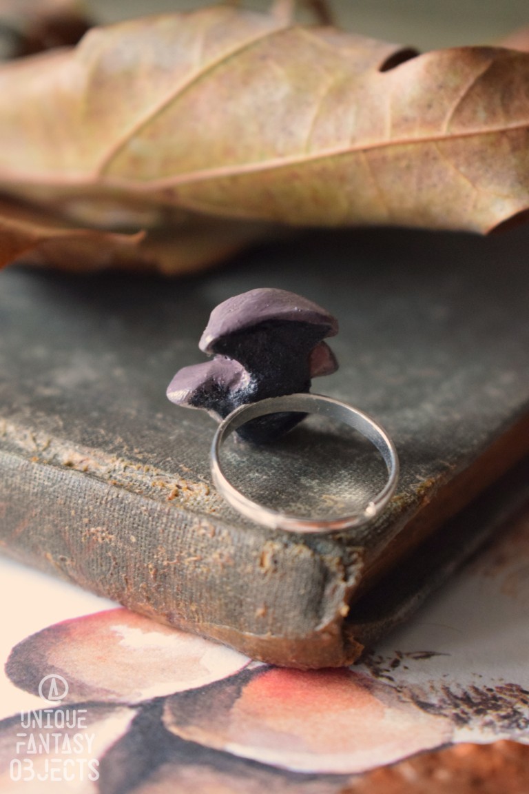 Na regulowanej bazie pierścionka wyrzeźbiłam rzeźbę z masy polimerowej, umieściłam na niej kamień, następnie pomalowałam ją farbami akrylowymi. Na koniec wszystko zabezpieczyłam lakierem artystycznym, dzięki czemu kolory nie zbledną pod wpływem promieni słonecznych i użytkowania.