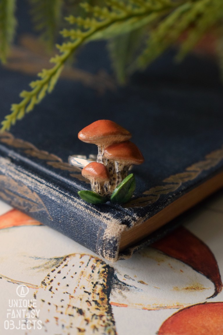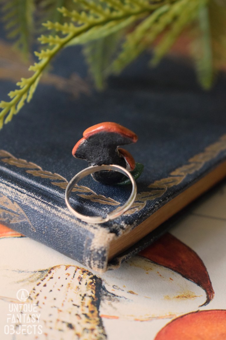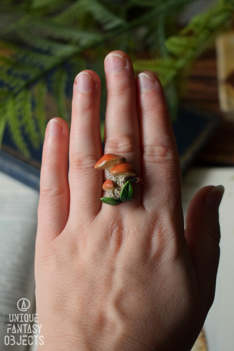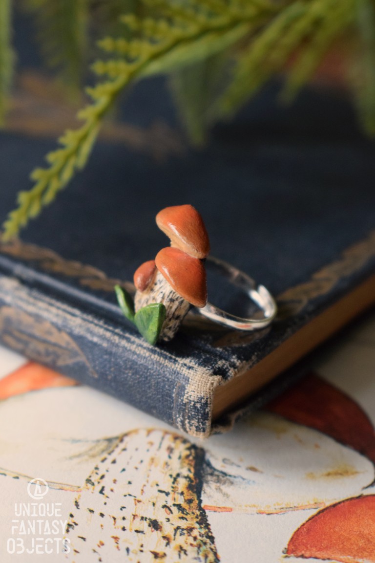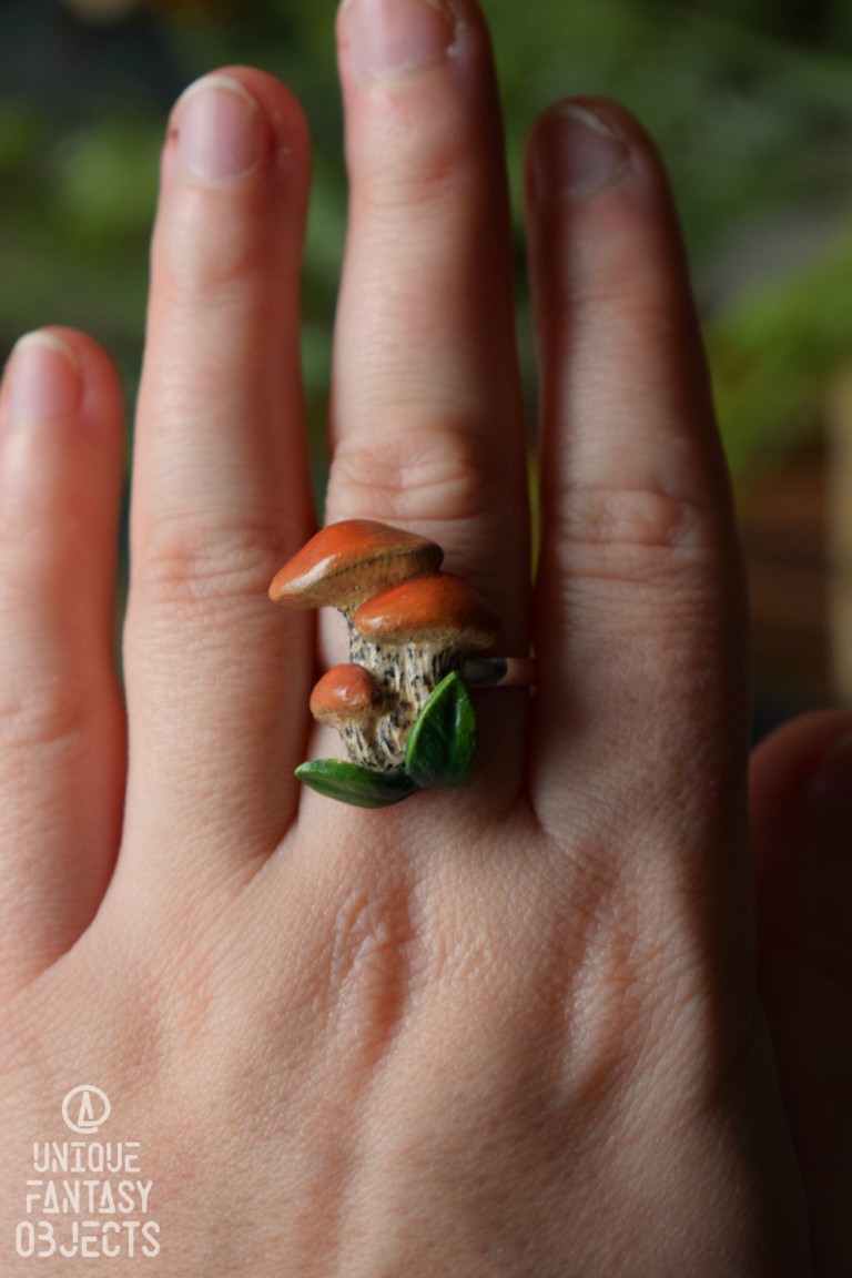 Na regulowanej bazie pierścionka wyrzeźbiłam rzeźbę z masy polimerowej, umieściłam na niej kamień, następnie pomalowałam ją farbami akrylowymi. Na koniec wszystko zabezpieczyłam lakierem artystycznym, dzięki czemu kolory nie zbledną pod wpływem promieni słonecznych i użytkowania.
