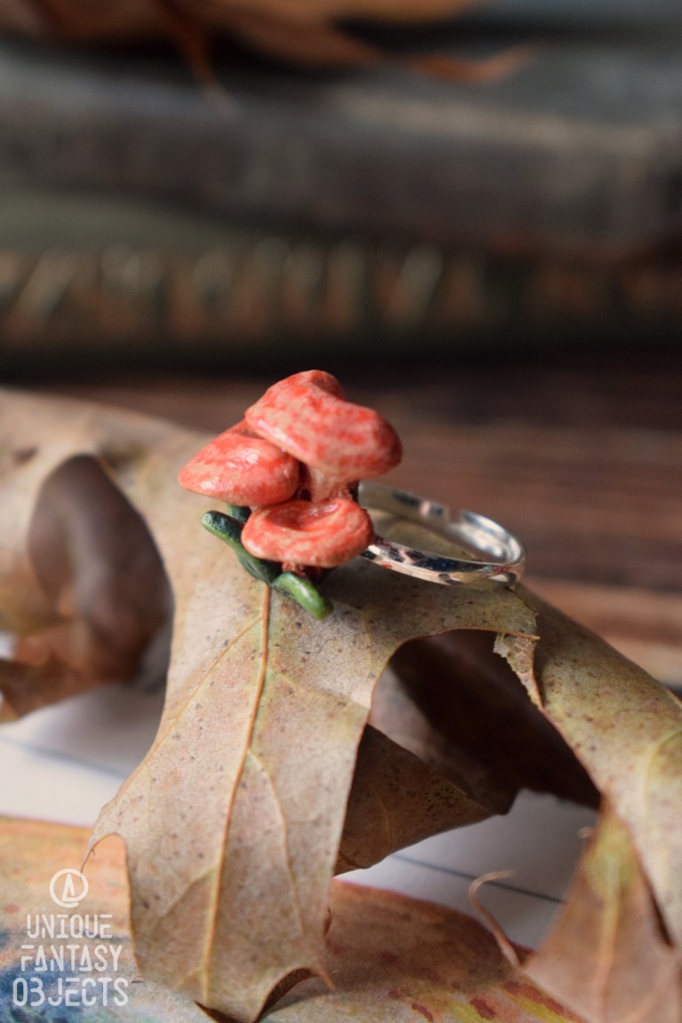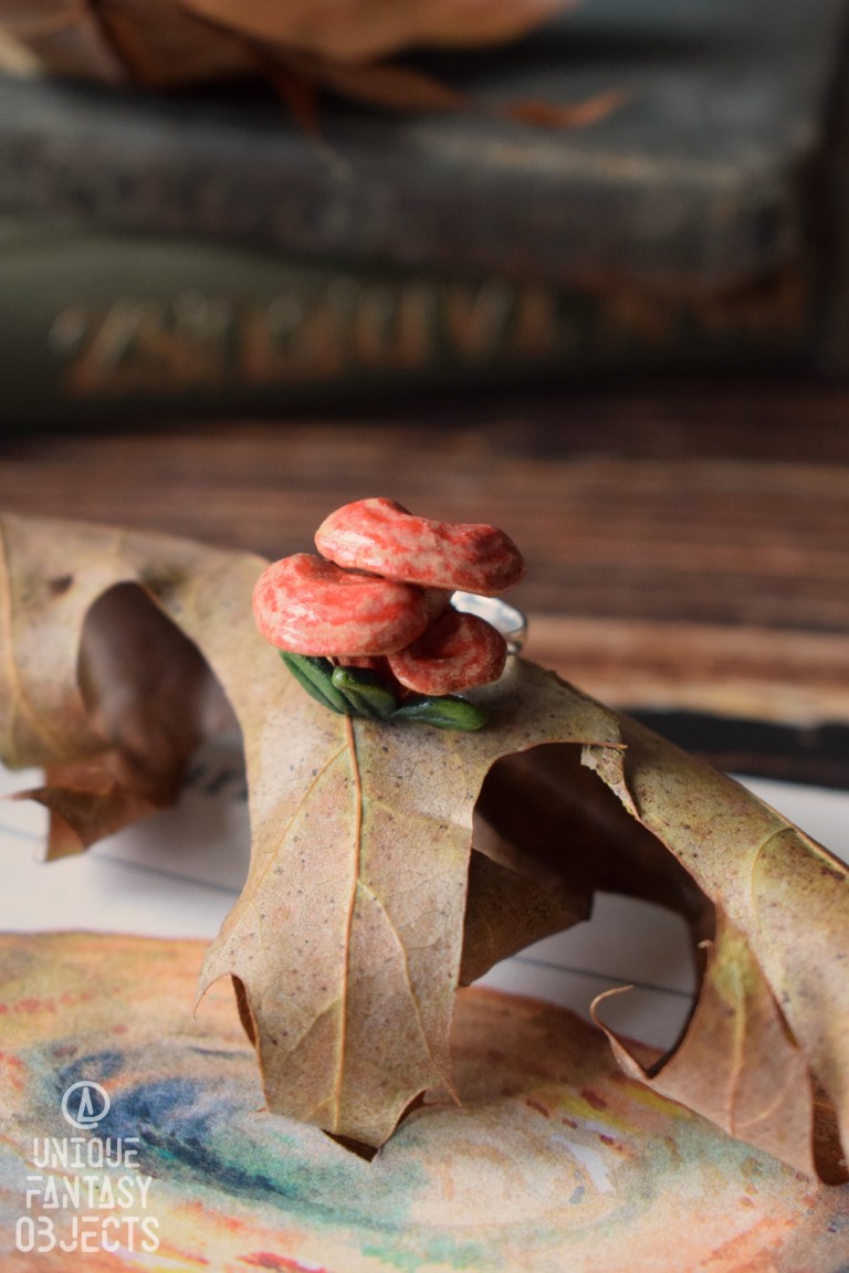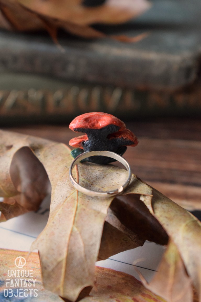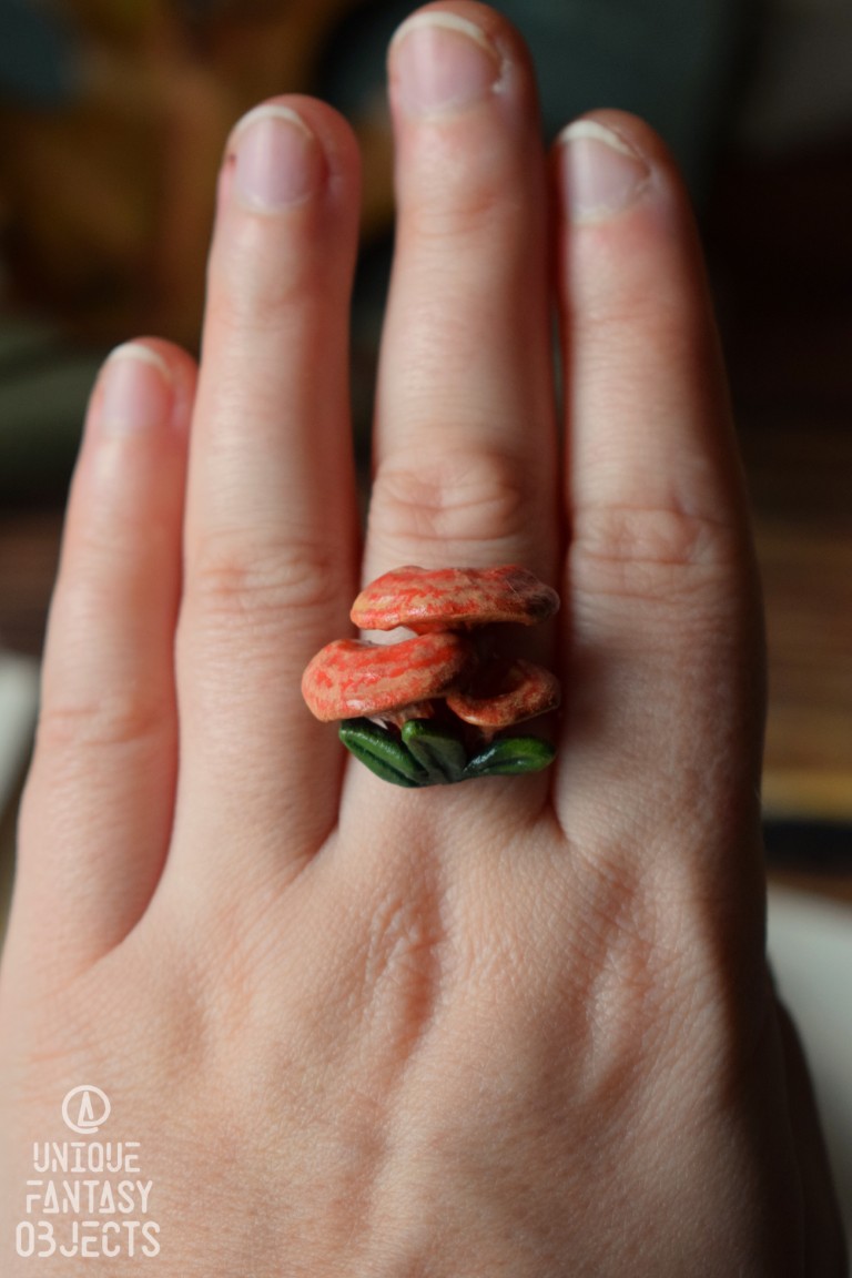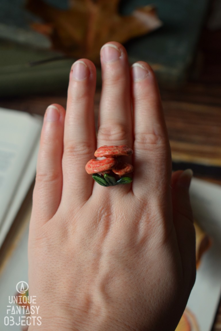 Na regulowanej bazie pierścionka wyrzeźbiłam rzeźbę z masy polimerowej, umieściłam na niej kamień, następnie pomalowałam ją farbami akrylowymi. Na koniec wszystko zabezpieczyłam lakierem artystycznym, dzięki czemu kolory nie zbledną pod wpływem promieni słonecznych i użytkowania.