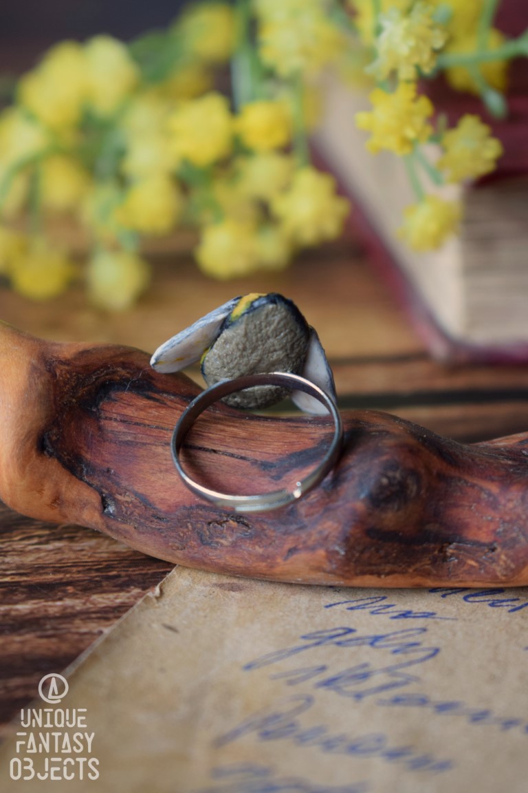 Na regulowanej bazie pierścionka wyrzeźbiłam rzeźbę z masy polimerowej, umieściłam na niej kamień, następnie pomalowałam ją farbami akrylowymi. Na koniec wszystko zabezpieczyłam lakierem artystycznym, dzięki czemu kolory nie zbledną pod wpływem promieni słonecznych i użytkowania.